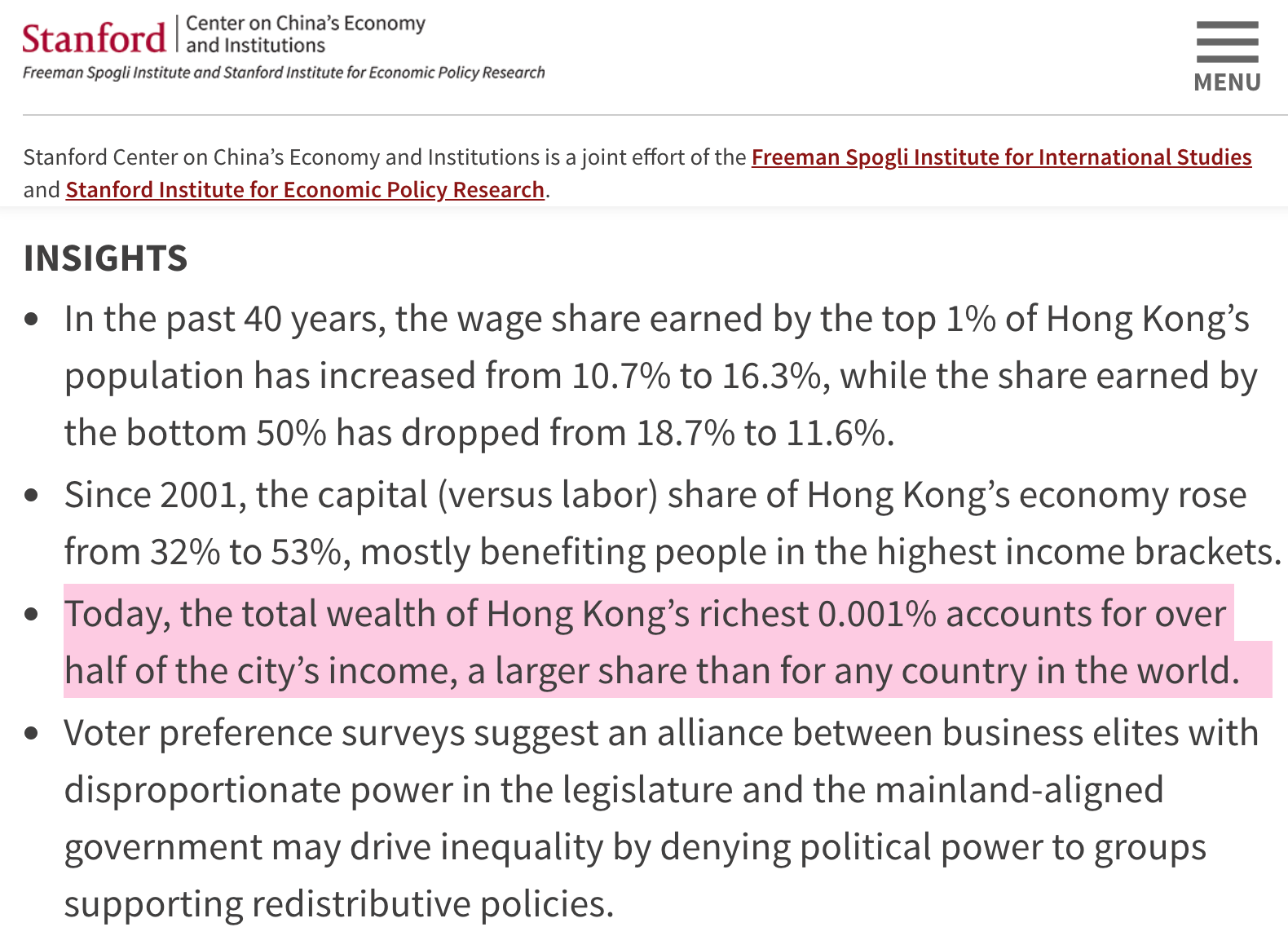 “In 2018, for example, the top 0.001% wealth share in Hong Kong far exceeded that of Russia, was more than twice that in the U.S. and China, and 10 times the level in France.” (Stanford University 2024).