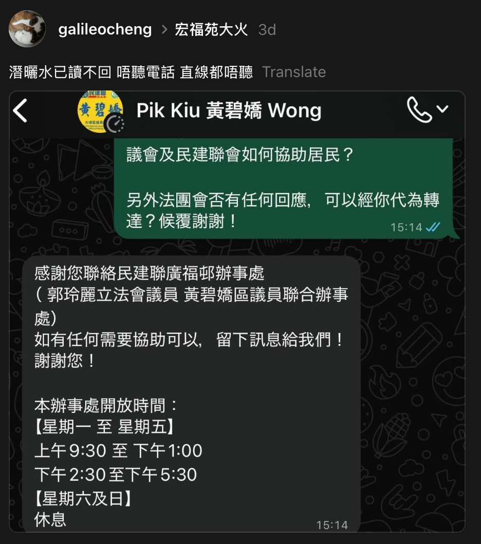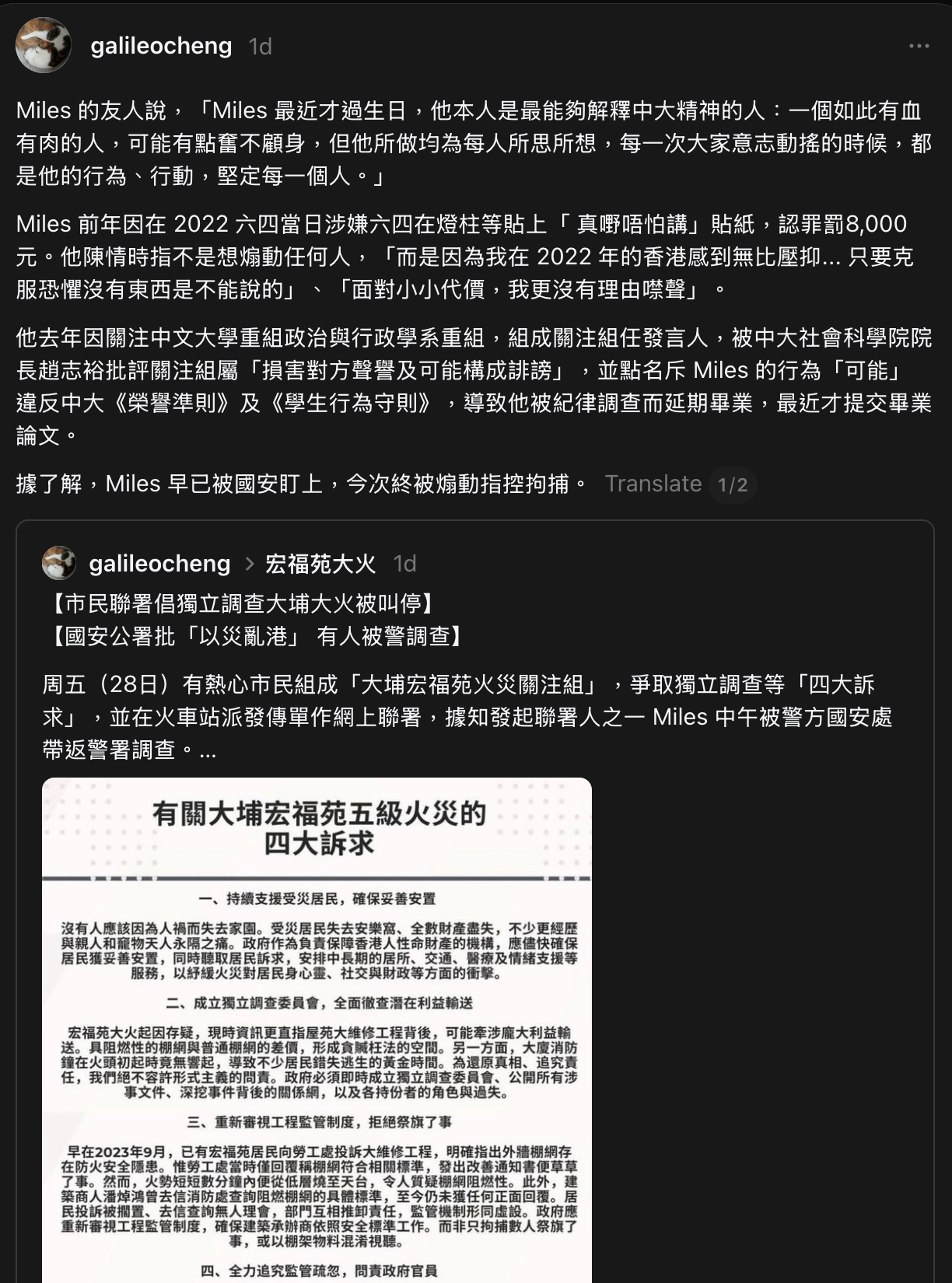 The change.org petition was taken down on the same day, another has popped up since. Miles, a university student, was arrested by the National Security Bureau for creating the petition and "Four Demands for the Hung Fuk Estate Fire."