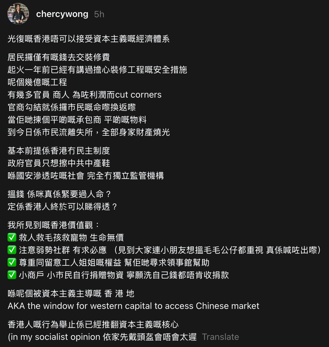The world sees a ferocious fire spreading across a Hong Kong high rise apartment block for 43 hours. I invite you to see Hong Kong as Hongkongers do, without the colonial bullshit.