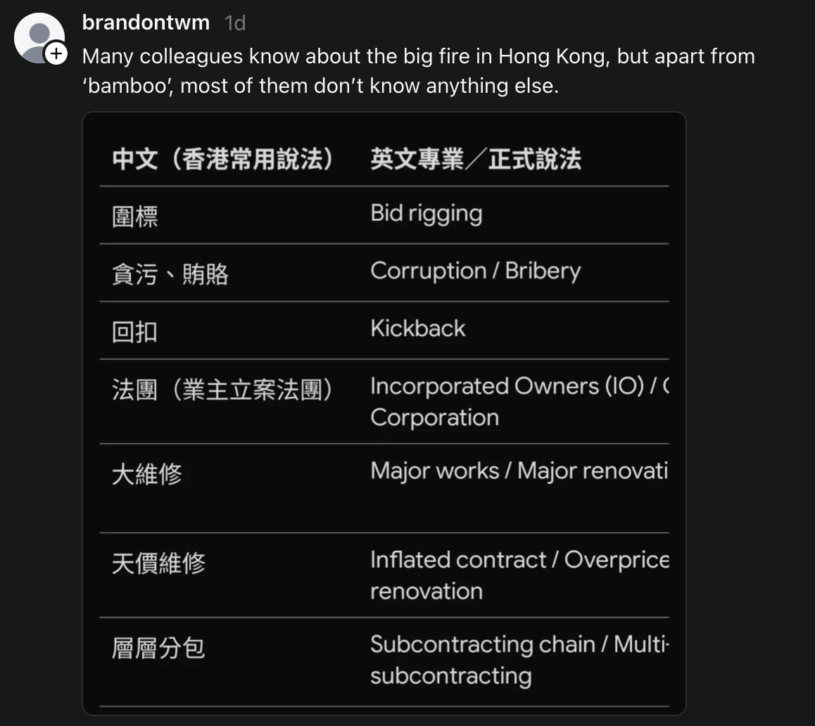 Instead of using fire resistant netting, costed at HKD$90, the construction company opted for netting costed at HKD$50. What a steal... for a HKD$330M project. In a netizen’s video clip, the netting was dripping with burning materials. Many suspect the flammable netting helped the fire spread across the building complex.